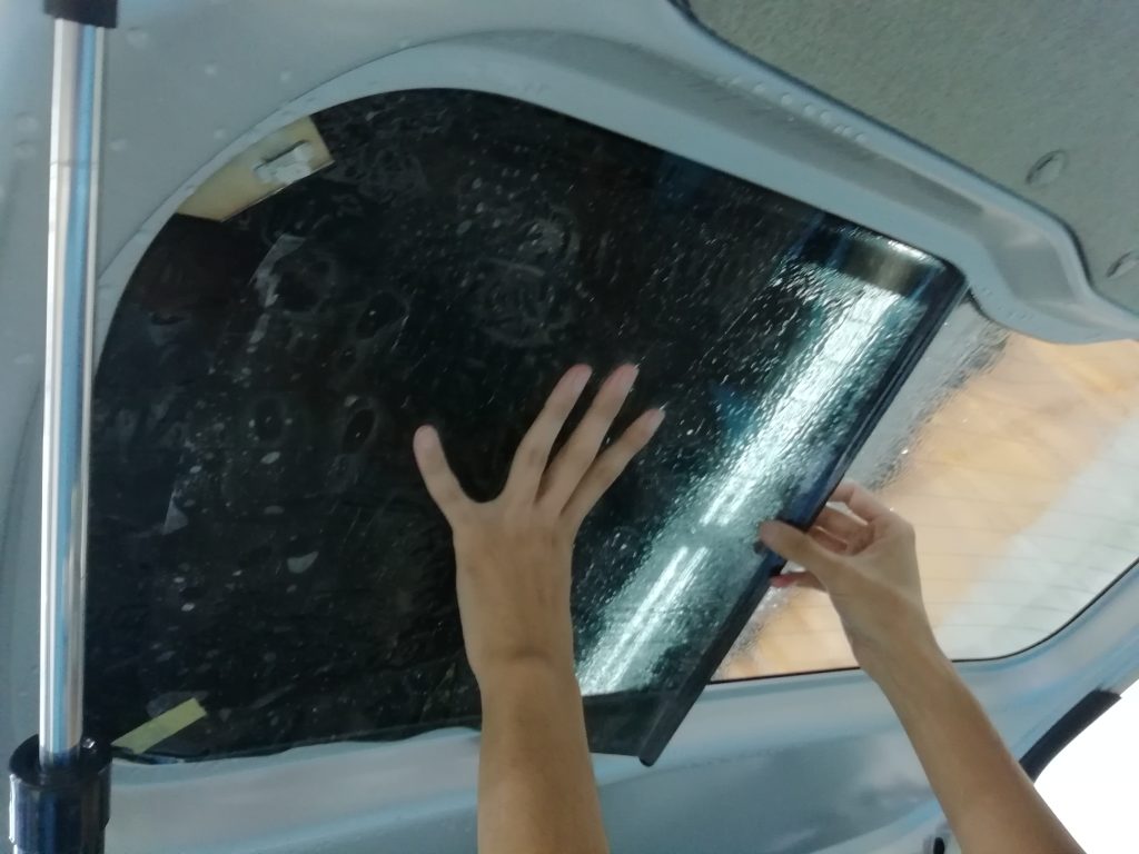 後部座席からリアガラスにかけて、断熱スモークフィルムの施工が基本となります。
